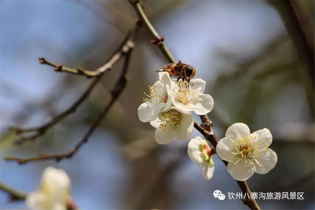 雖說梅花香自苦寒來,但陽光下的梅花更是吸引蝴蝶、蜜蜂的到來。一朵朵白色的小花在藍(lán)天和綠色的植物相襯下,相映成趣、美景如畫!