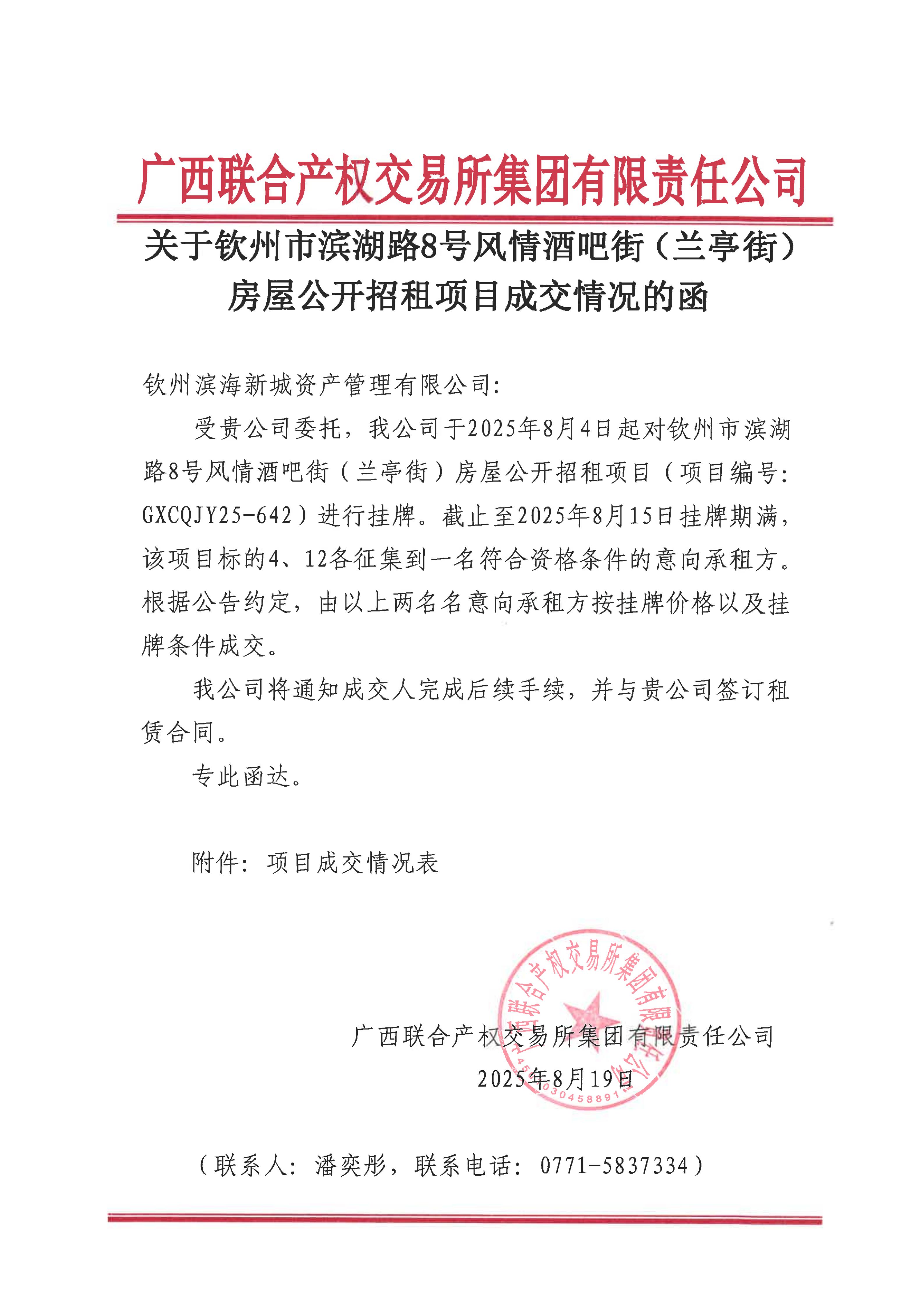 關(guān)于欽州市濱湖路8號(hào)風(fēng)情酒吧街(蘭亭街)房屋公開招租項(xiàng)目成交情況的函(3#-01、9#-3)