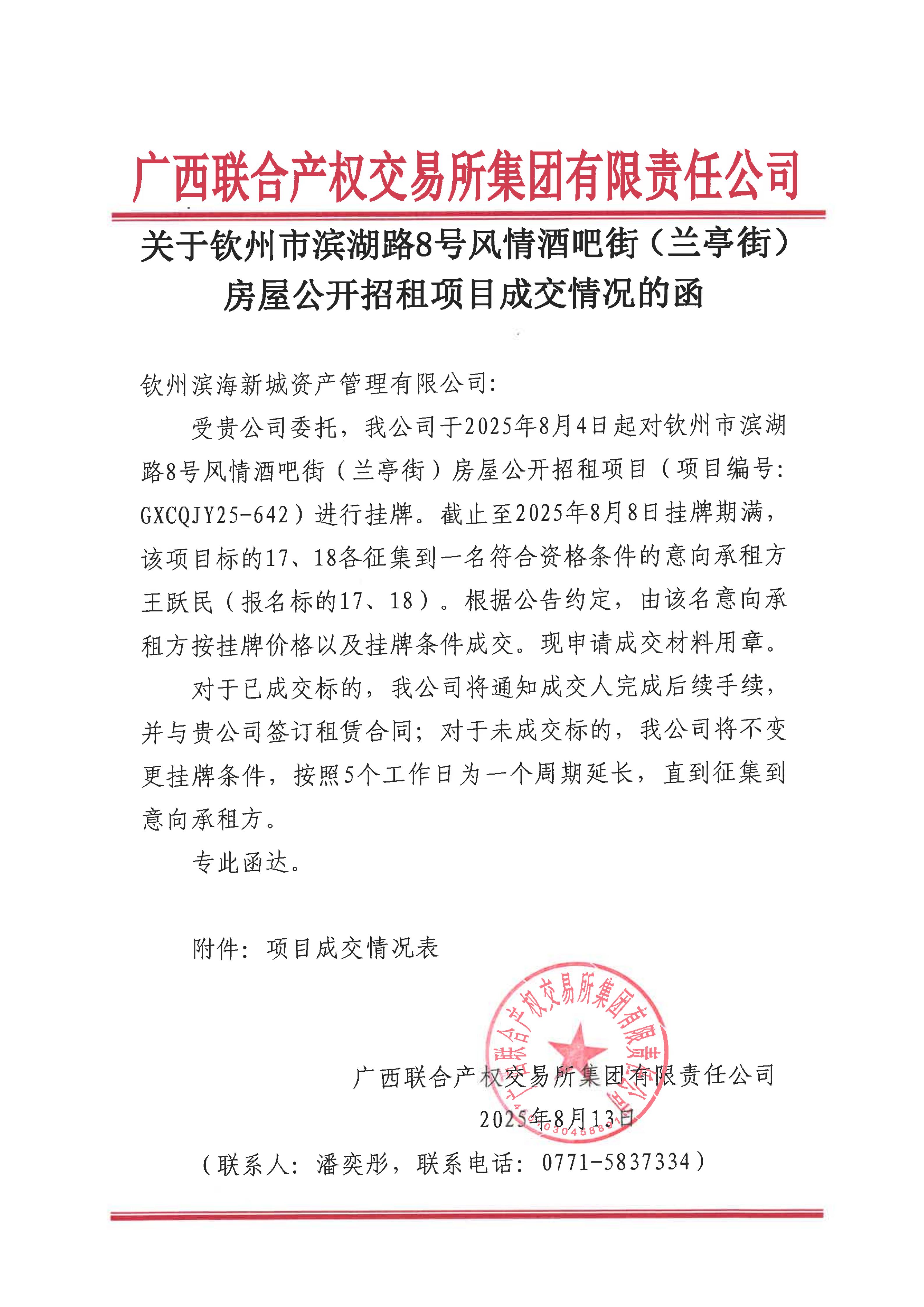 關(guān)于欽州市濱湖路8號(hào)風(fēng)情酒吧街(蘭亭街)房屋公開招租項(xiàng)目成交情況的函(13北)
