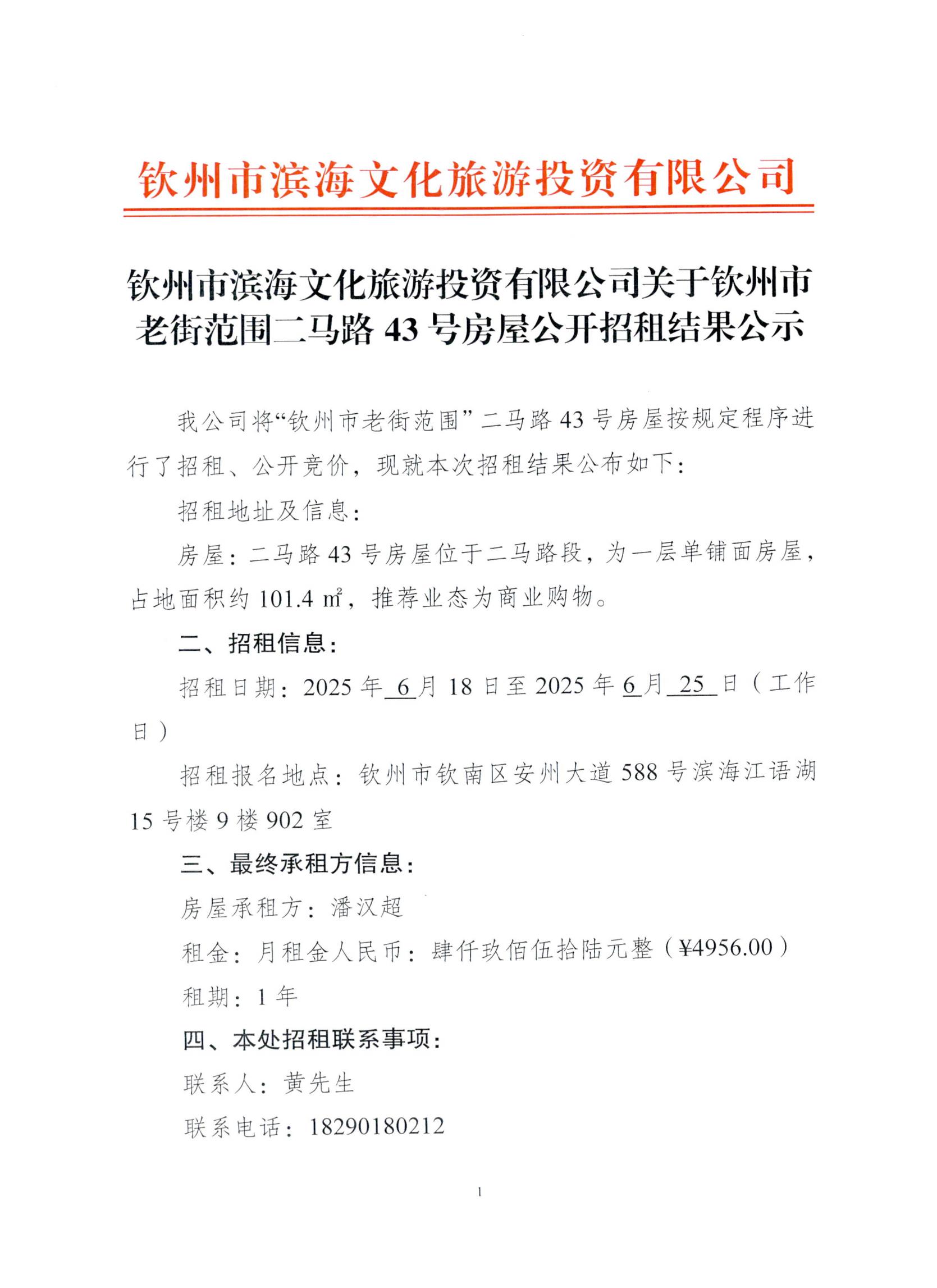 欽州市濱海文化旅游投資有限公司關于欽州市老街范圍二馬路43號房屋公開招...