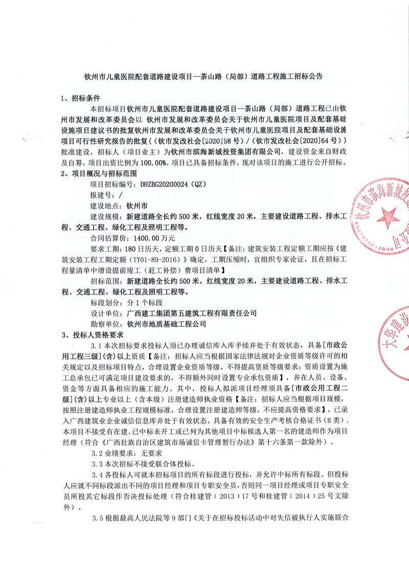 欽州市兒童醫(yī)院配套道路建設(shè)項目—茶山路(局部)道路工程施工招標(biāo)公告