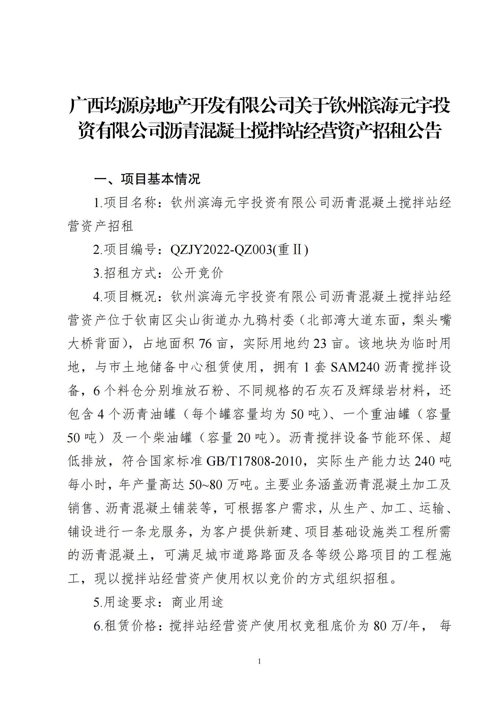 關于欽州濱海元宇投資有限公司瀝青混凝土攪拌站經(jīng)營資產(chǎn)招租公告