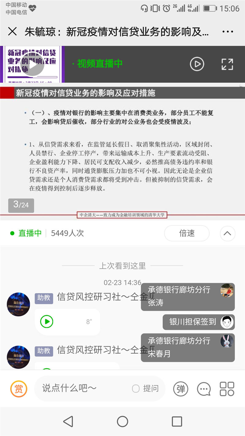2020年2月23日下午,我公司員工集體參加銀行信貸風險專家朱毓瓊老師主講的“新冠疫情對信貸業(yè)務的影響及應對措施”專題網課。通過本次網課培訓,系統(tǒng)地學習了解新冠疫情對融資擔保行業(yè)的影響,充分認識本次新型冠狀病毒肺炎疫情對融資擔保行業(yè)的影響和沖擊,以及學習各地監(jiān)管部門的最新政策和應對措施。