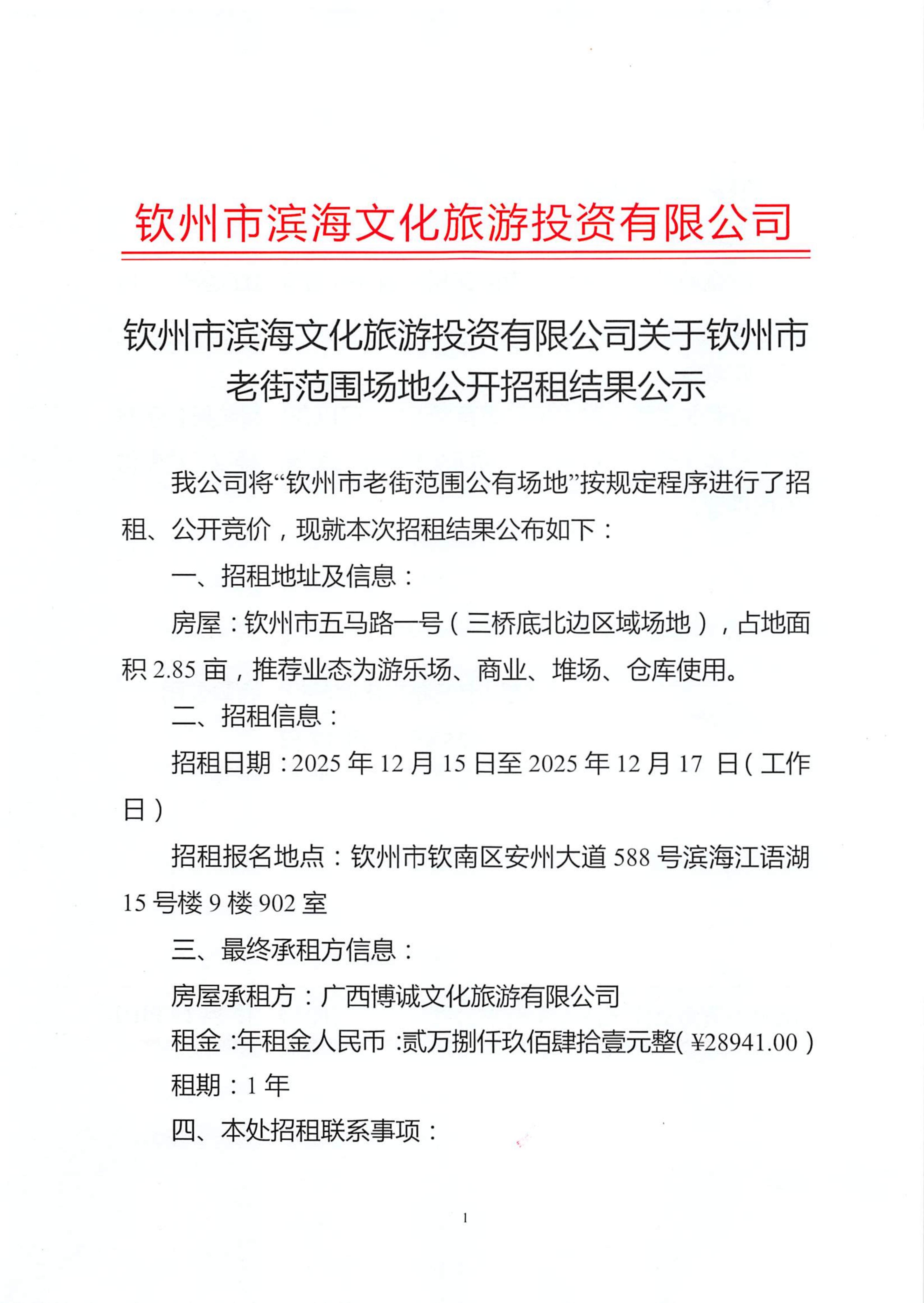 欽州市濱海文化旅游投資有限公司關(guān)于欽州市老街范圍2處房屋公開招租結(jié)果公示