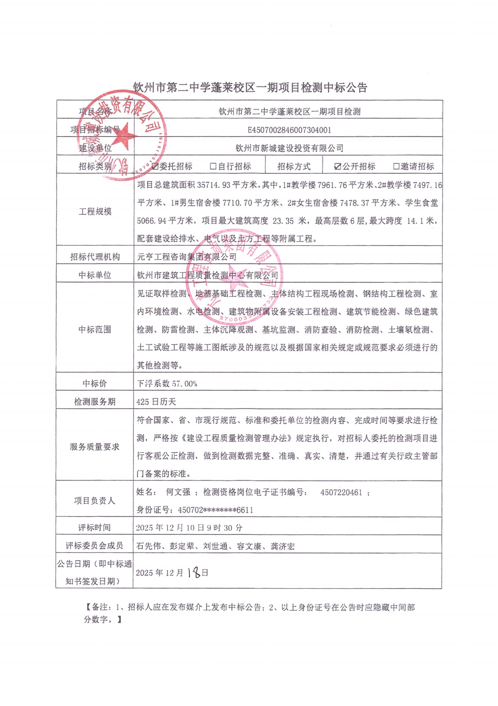 欽州市第二中學(xué)蓬萊校區(qū)一期項目檢測中標(biāo)公告