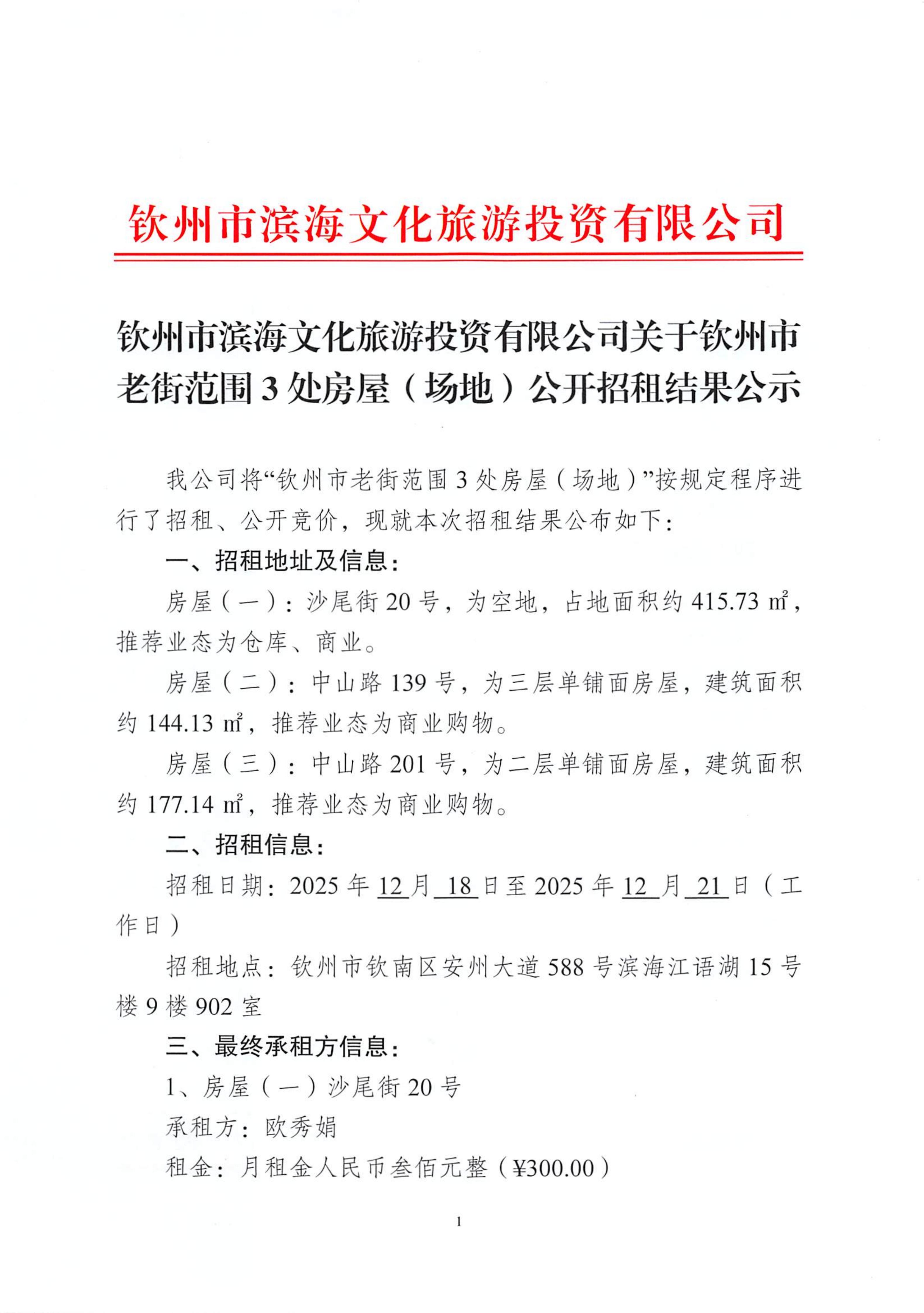 欽州市濱海文化旅游投資有限公司關(guān)于欽州市老街范圍3處房屋(場地)公開招租結(jié)果公示(沙尾街20號、中山路139號、中山路201號)