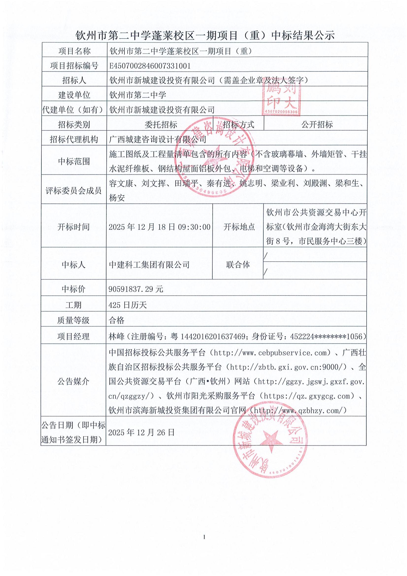 欽州市第二中學(xué)蓬萊校區(qū)一期項目(重)中標(biāo)結(jié)果公示