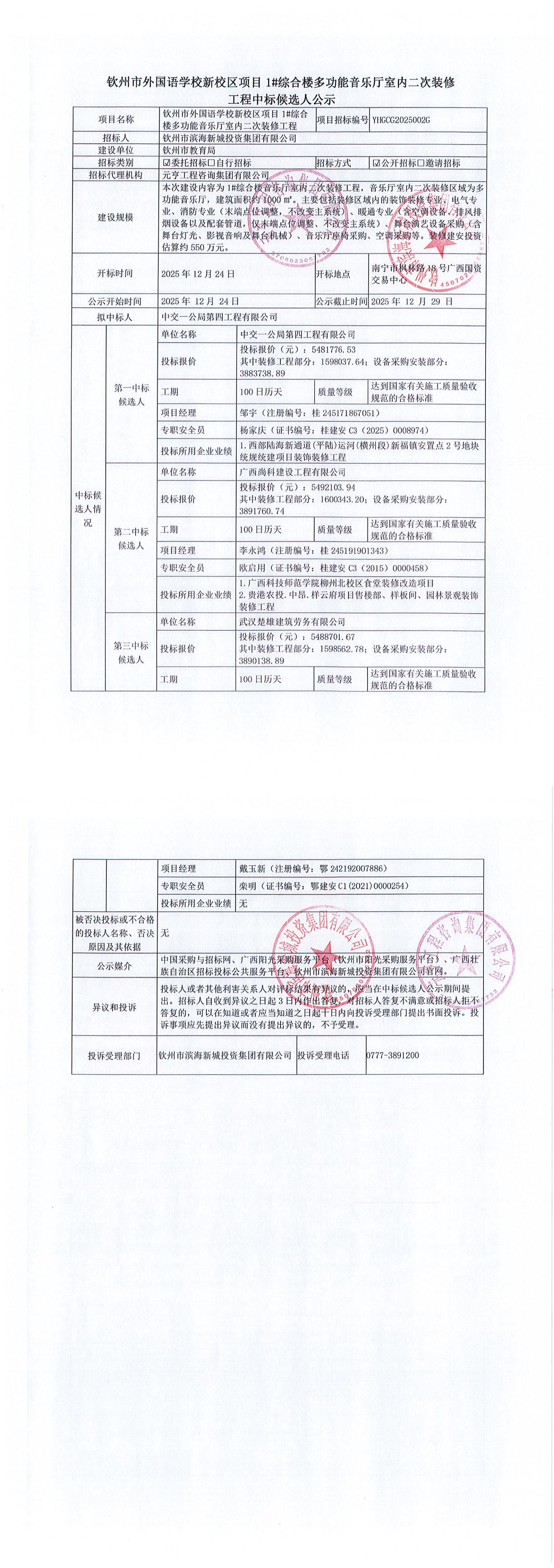 欽州市外國語學(xué)校新校區(qū)項目1#綜合樓多功能音樂廳室內(nèi)二次裝修工程中標(biāo)候選人公示