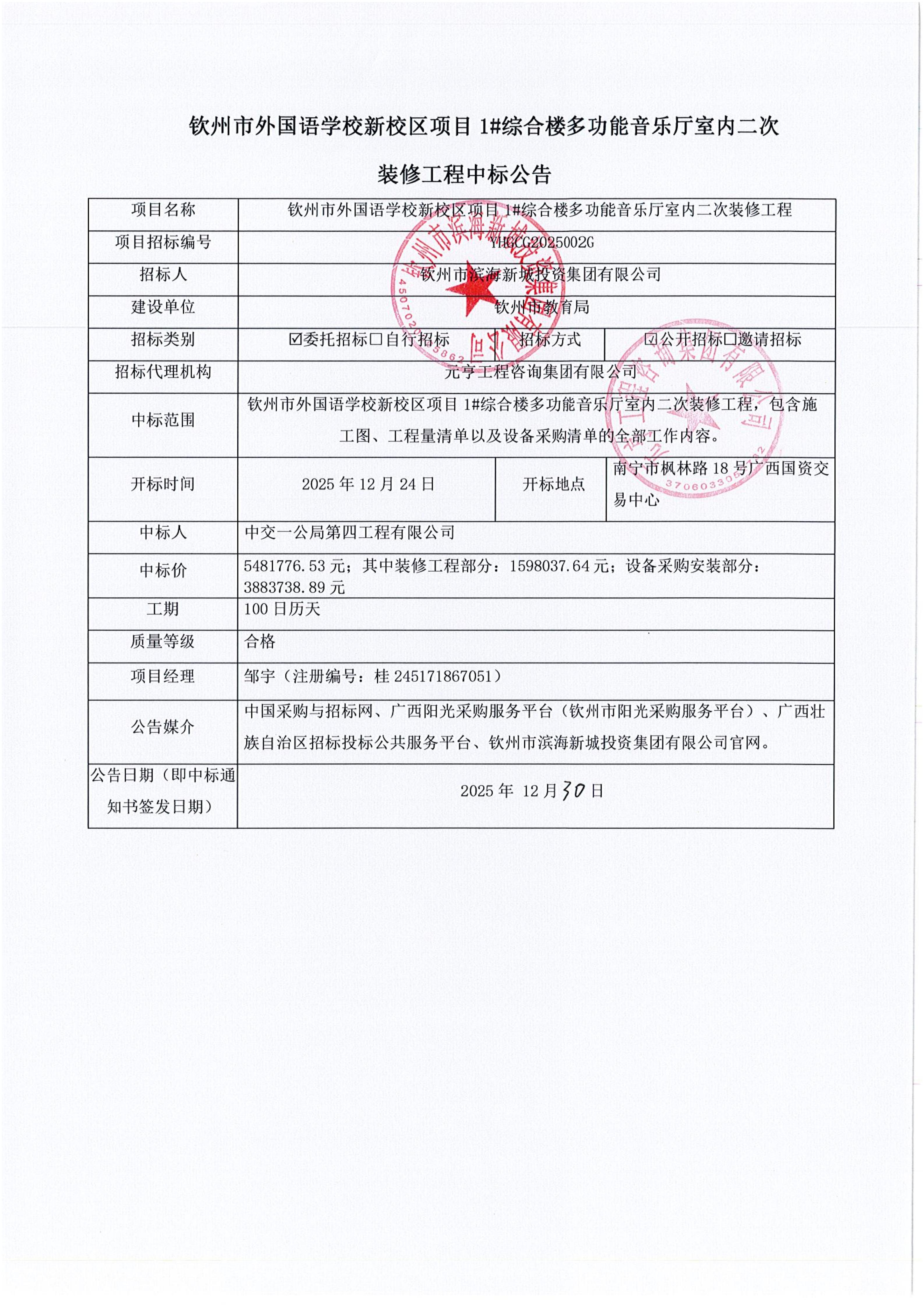 欽州市外國語學(xué)校新校區(qū)項目1#綜合樓多功能音樂廳室內(nèi)二次裝修工程中標(biāo)公告
