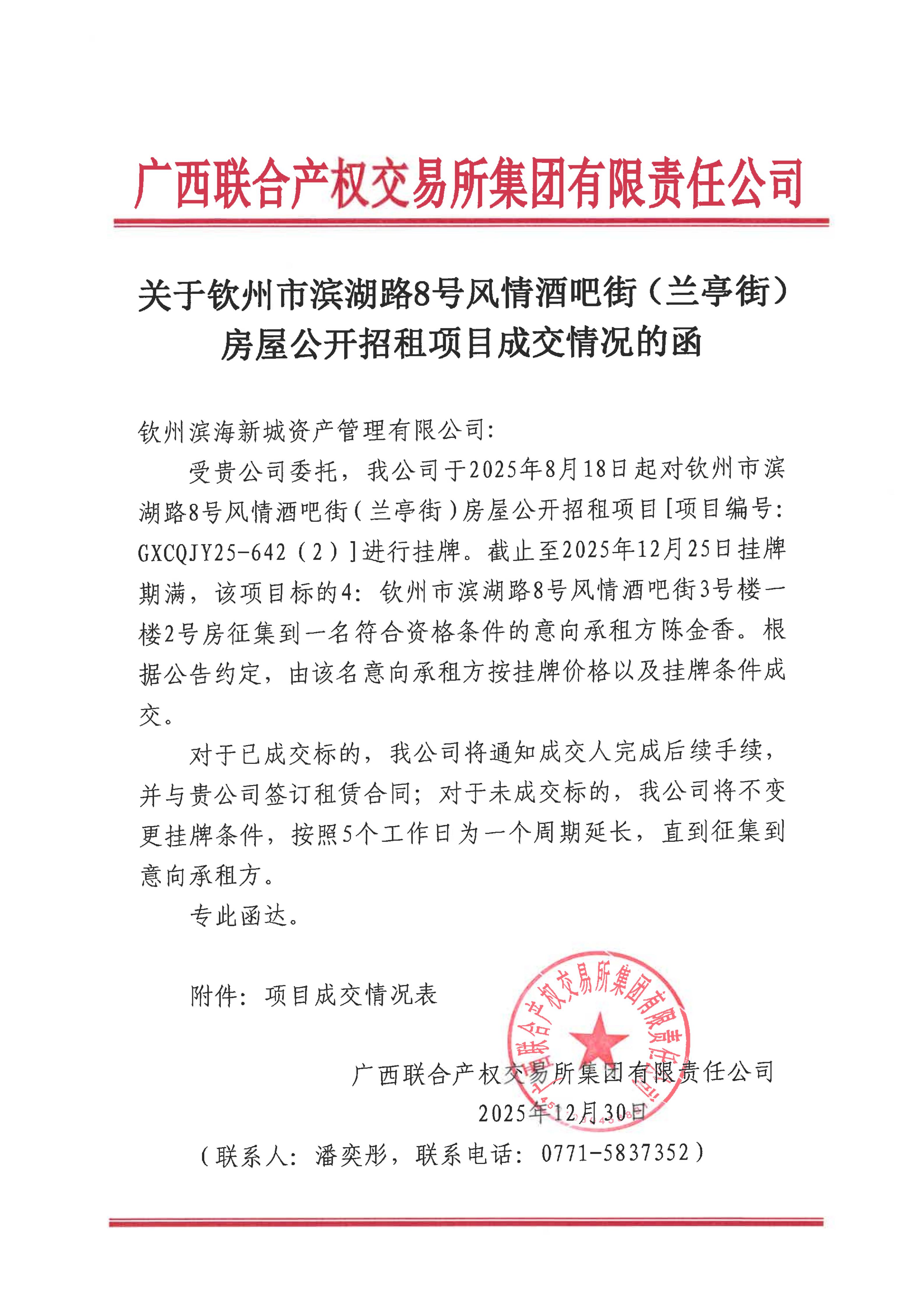 關(guān)于欽州市濱湖路8號風(fēng)情酒吧街(蘭亭街)房屋公開招租項目成交情況的函(3#-02)