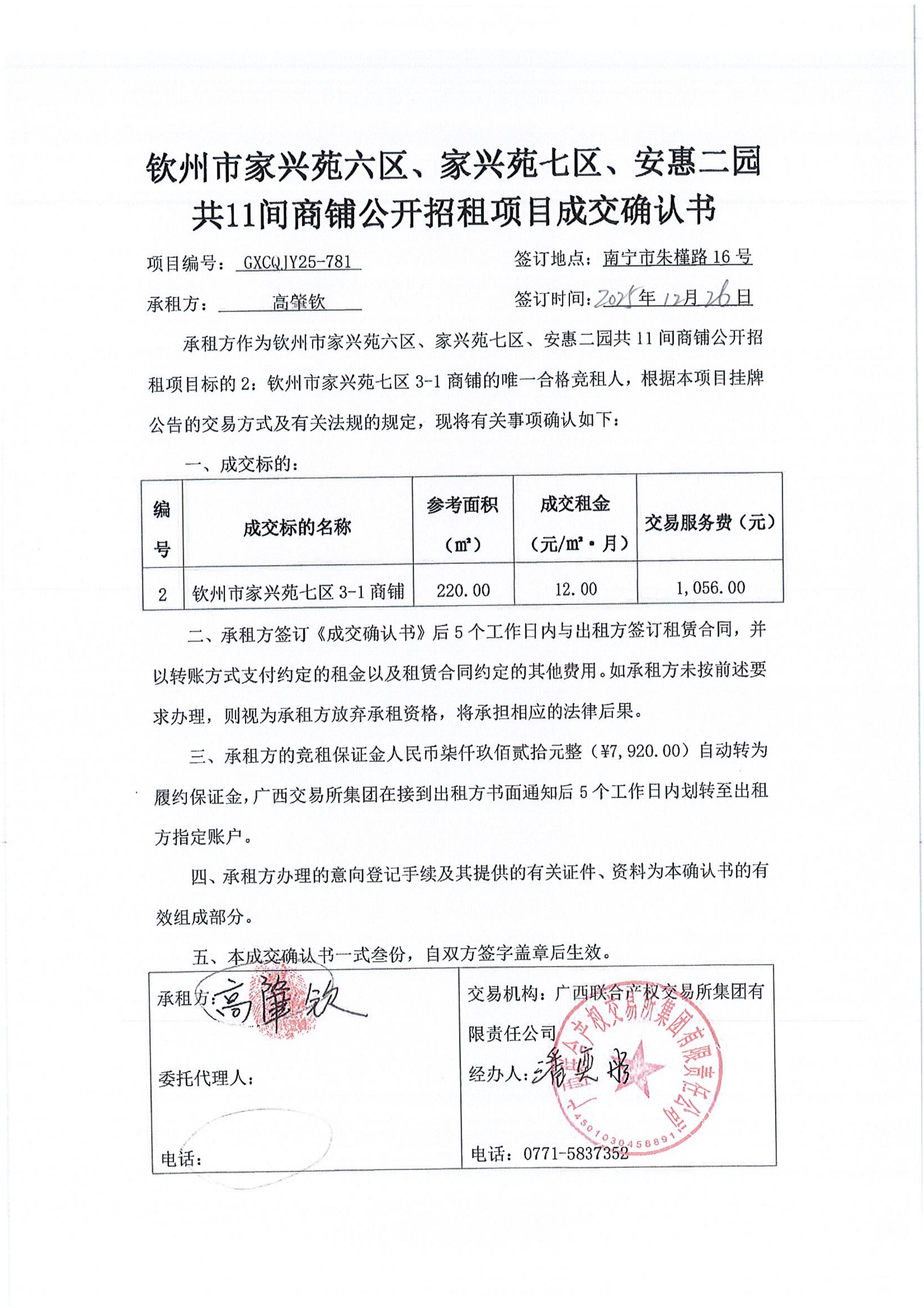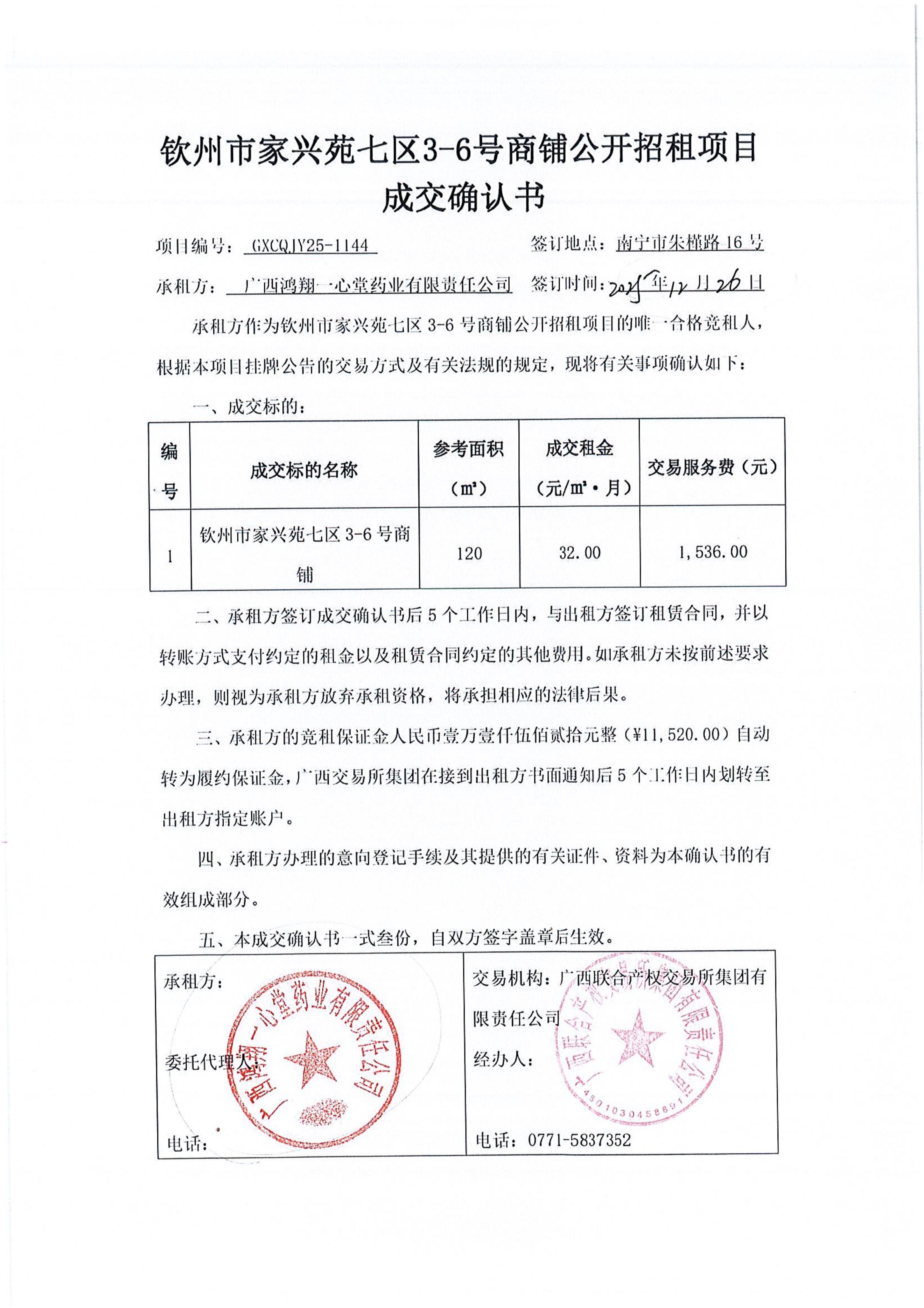 欽州市家興苑七區(qū)3-6號商鋪公開招租項目 成交確認書