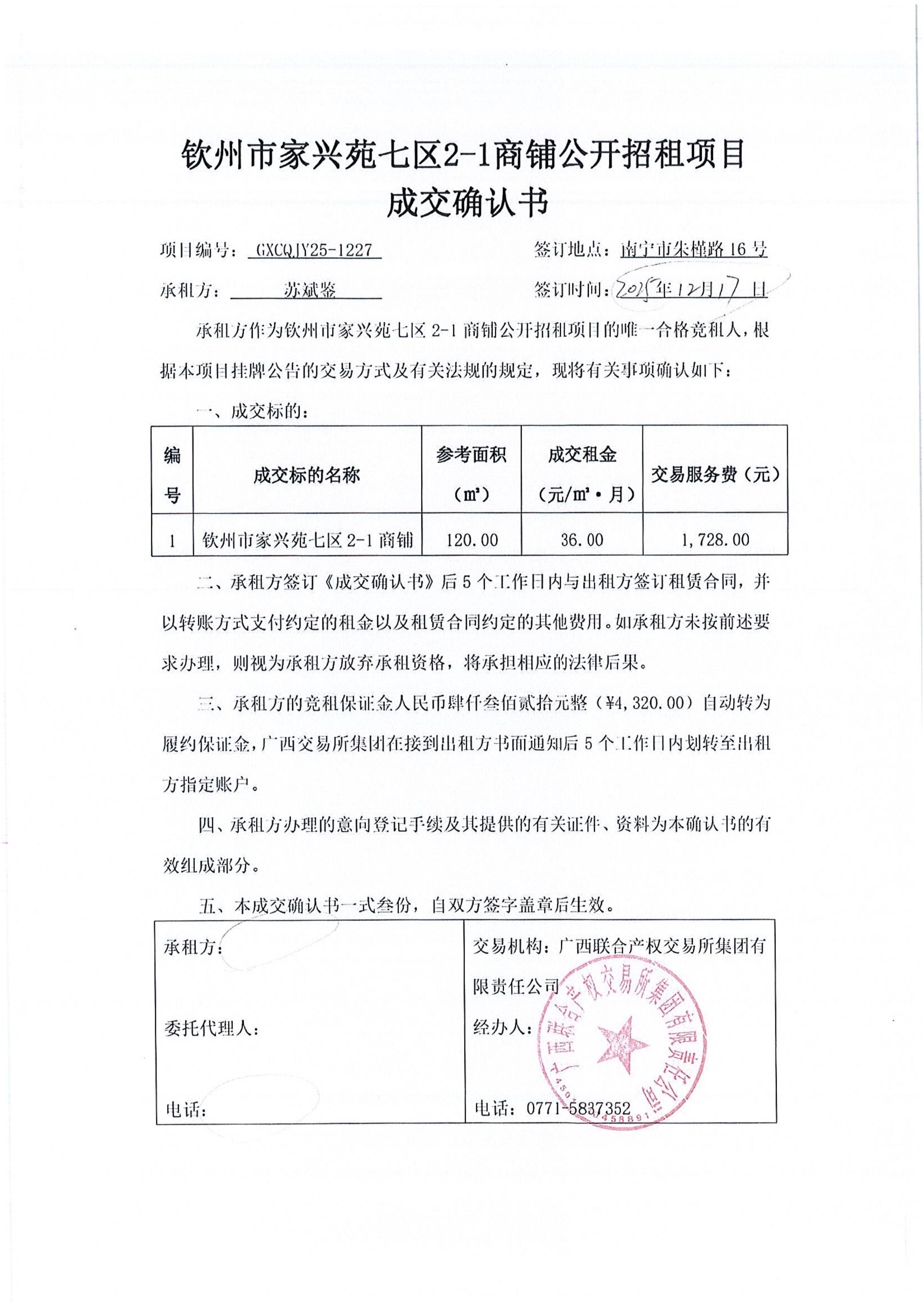 欽州市家興苑七區(qū)2-1商鋪公開招租項目 成交確認書