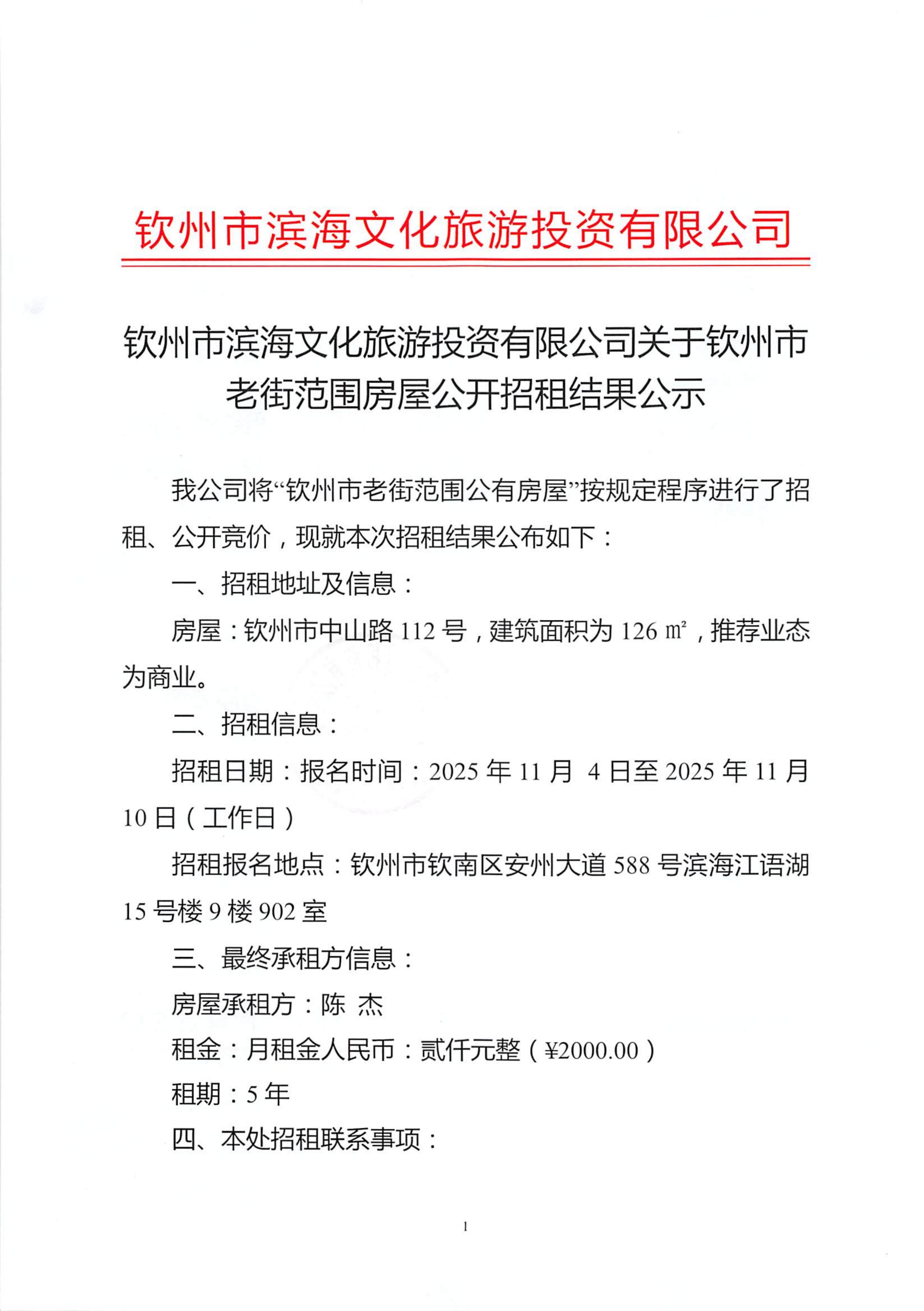 欽州市濱海文化旅游投資有限公司關(guān)于欽州市老街范圍房屋公開(kāi)招租結(jié)果公示(欽州市中山路112號(hào))