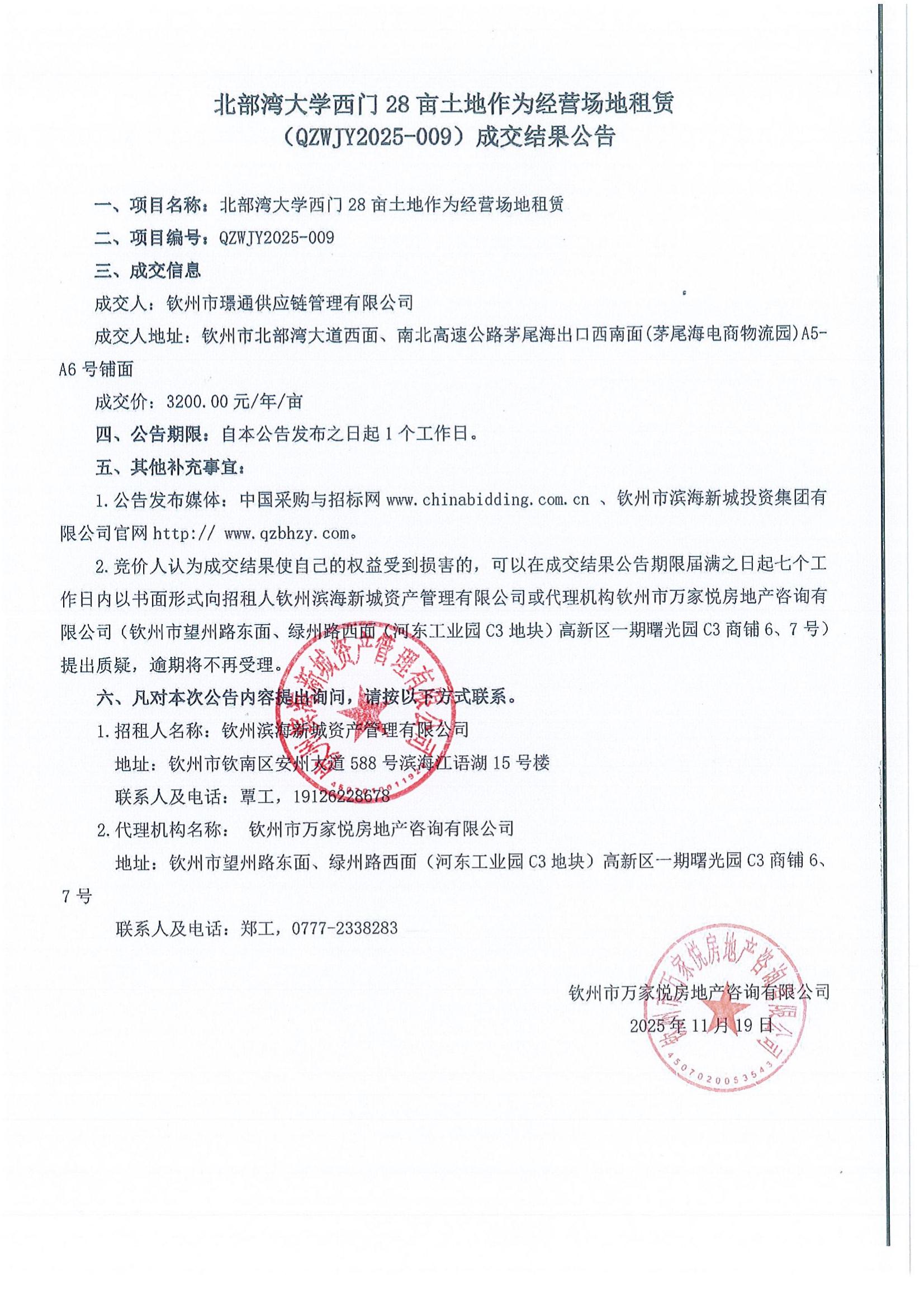 北部灣大學(xué)西門28畝土地作為經(jīng)營場地租賃(QZWJY2025-009)成交結(jié)果公告