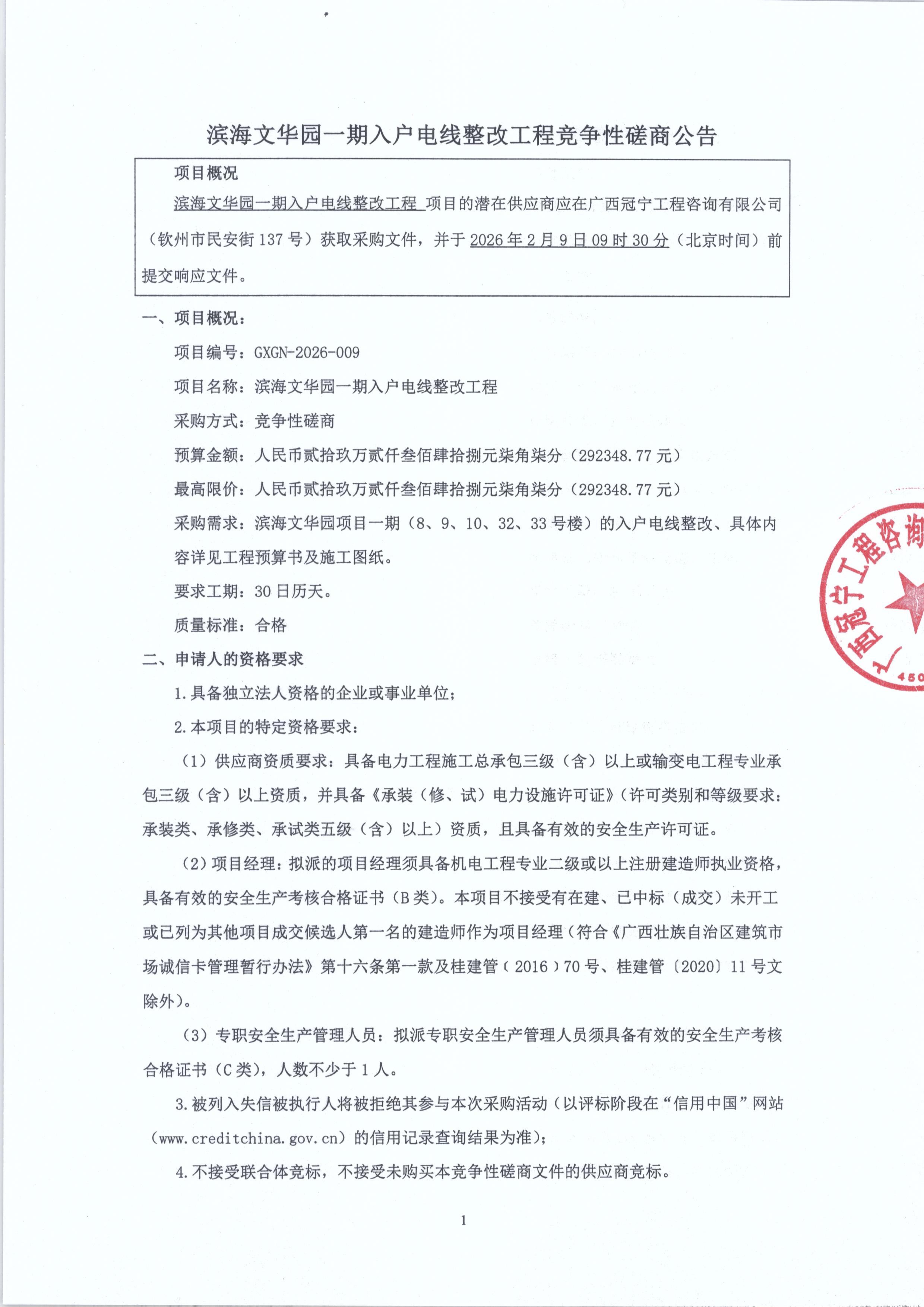 濱海文華園一期入戶電線整改工程競爭性磋商公告