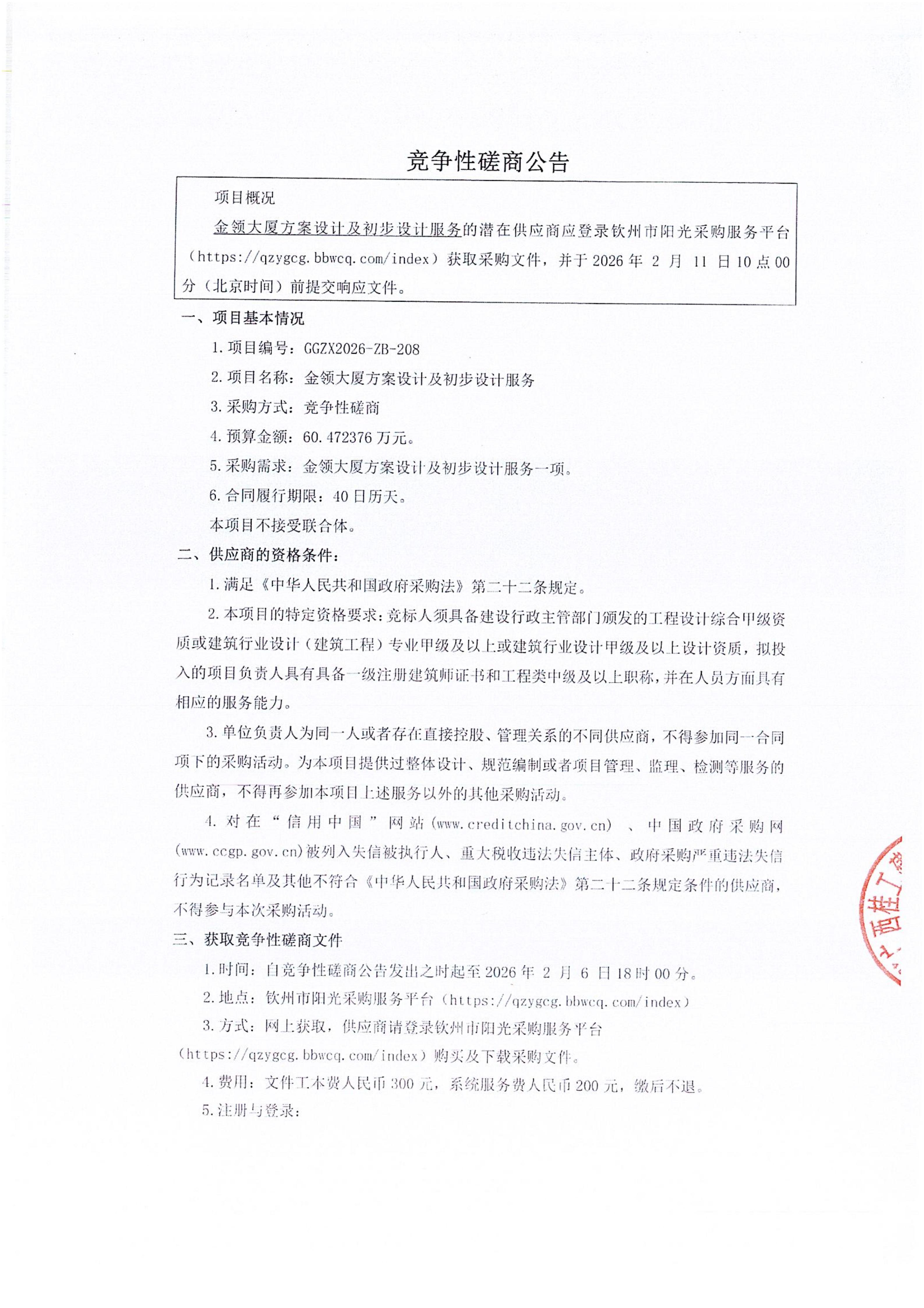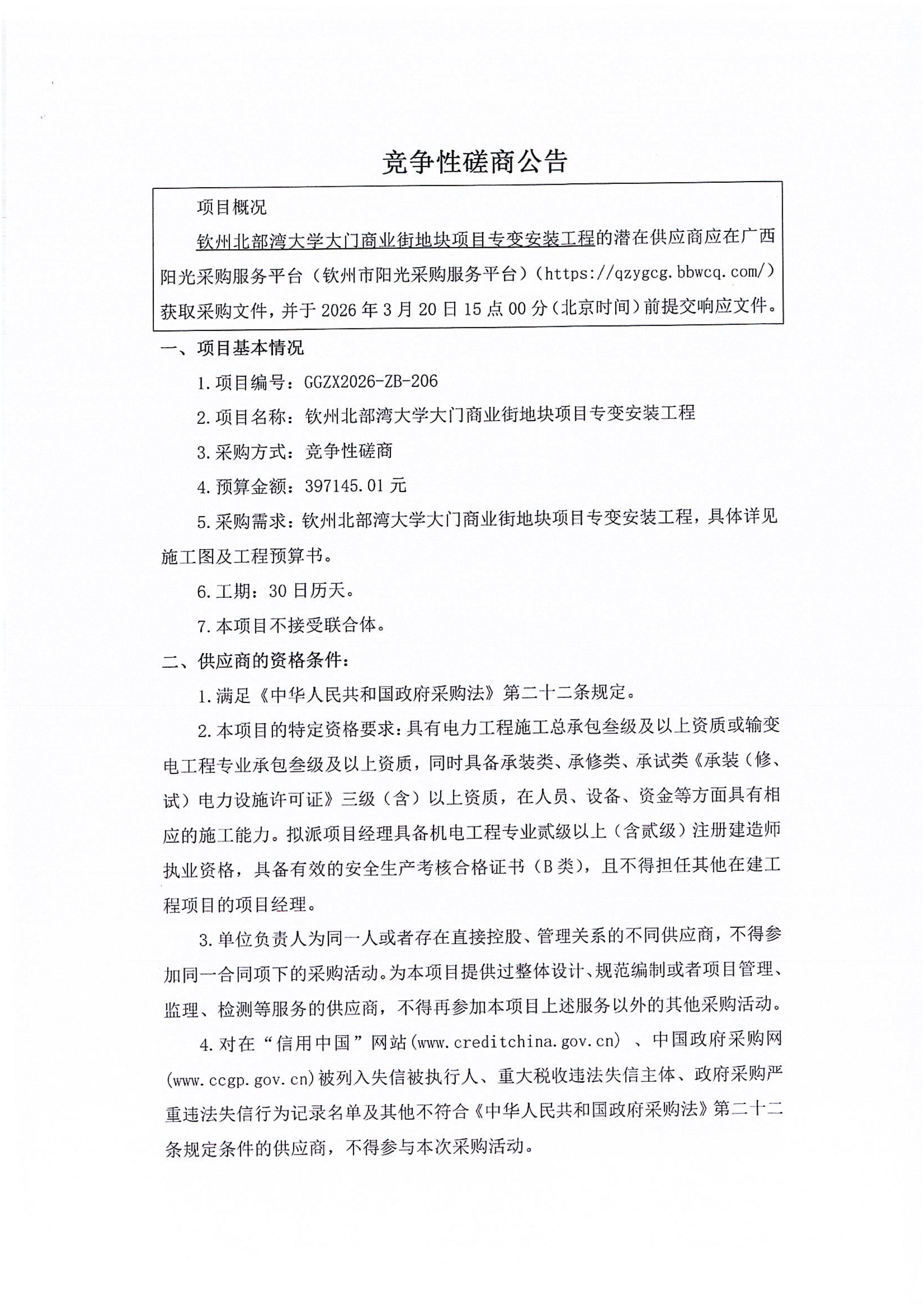競爭性磋商公告(欽州北部灣大學(xué)大門商業(yè)街地塊項(xiàng)目專變安裝工程)