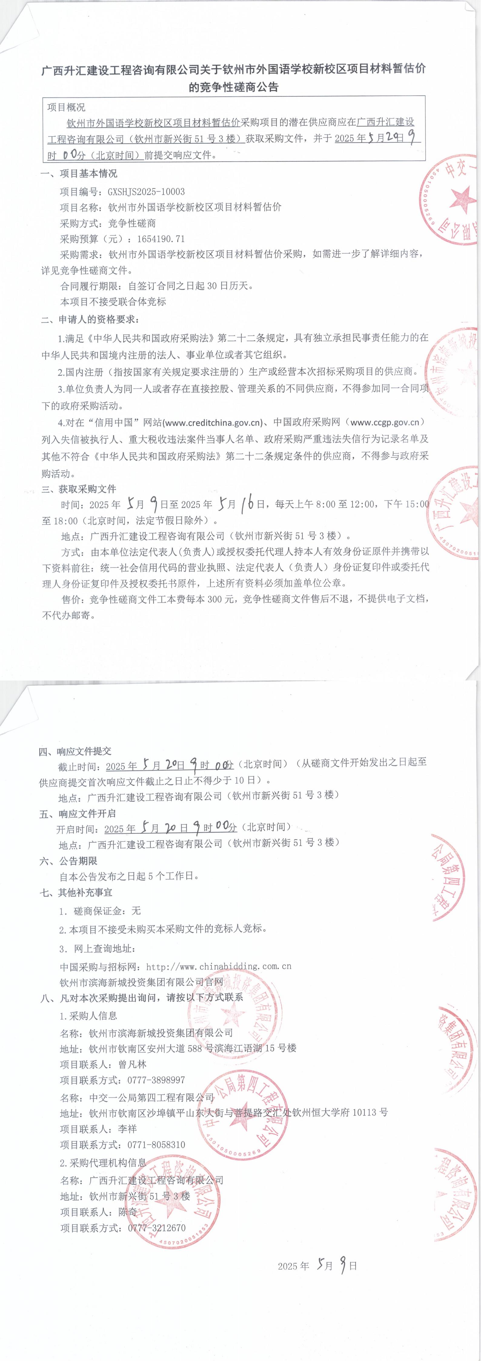 關(guān)于欽州市外國語學(xué)校新校區(qū)項(xiàng)目材料暫估價(jià)的競爭性磋商公告