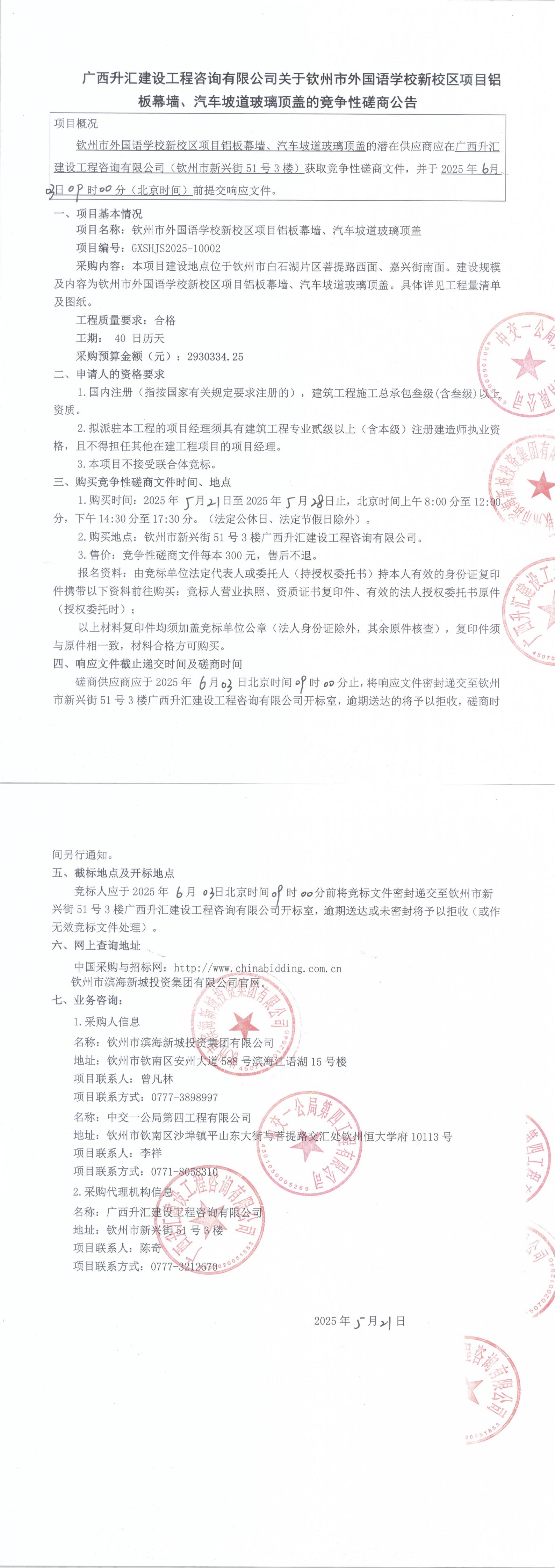 廣西升匯建設(shè)工程咨詢有限公司關(guān)于欽州市外國語學(xué)校新校區(qū)項(xiàng)目鋁板幕墻、汽車坡道玻璃頂蓋的競爭性磋商公告