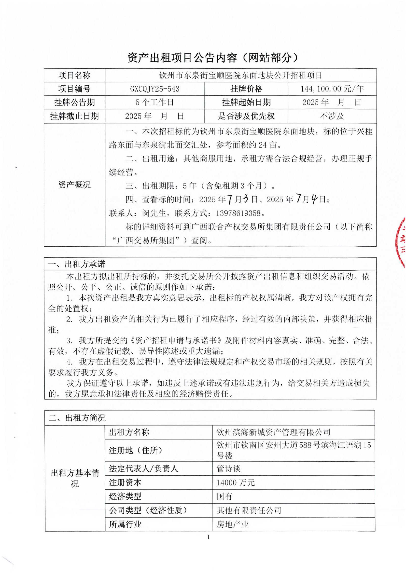 欽州市東泉街寶順醫(yī)院東面地塊公開招租項(xiàng)目